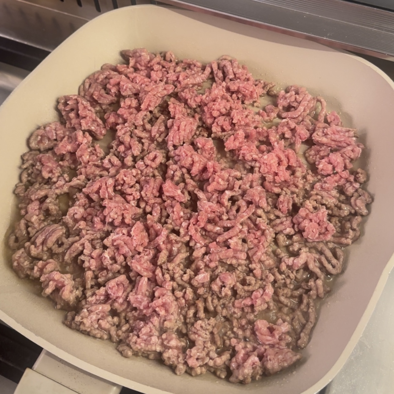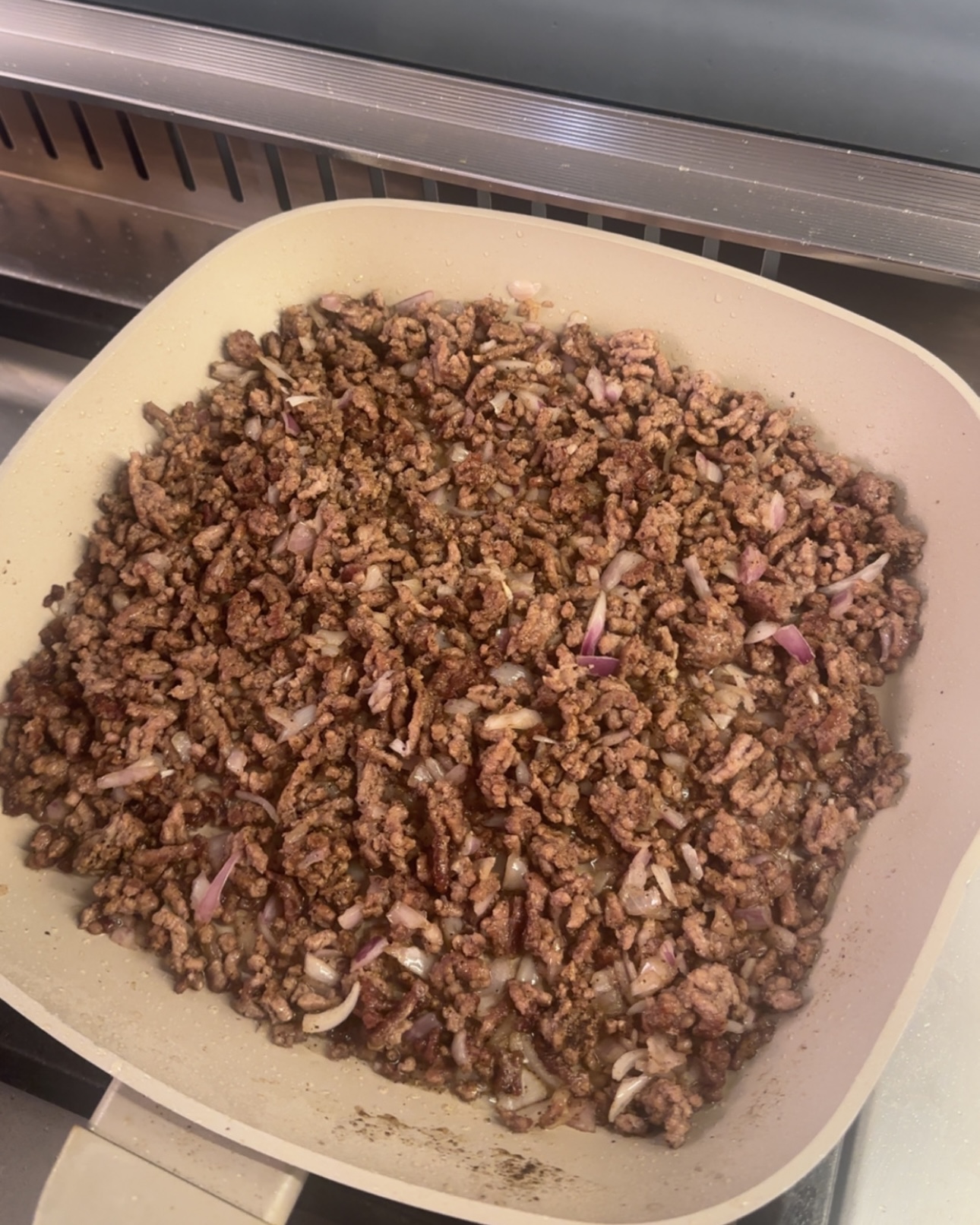 Tambahkan minyak zaitun, lalu daging dan biarkan matang.