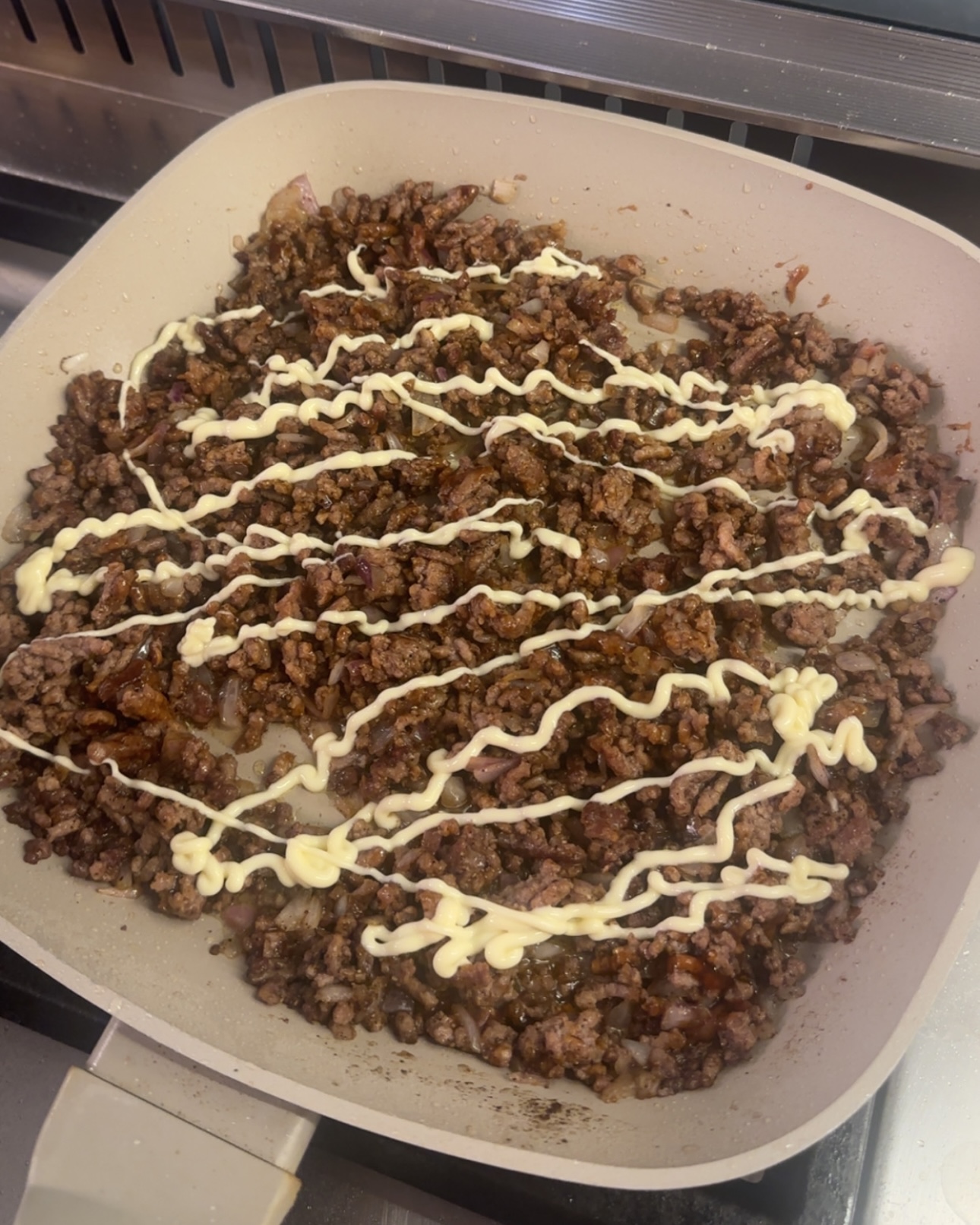 Tambah mayones dan saus barbekyu, lalu aduk.