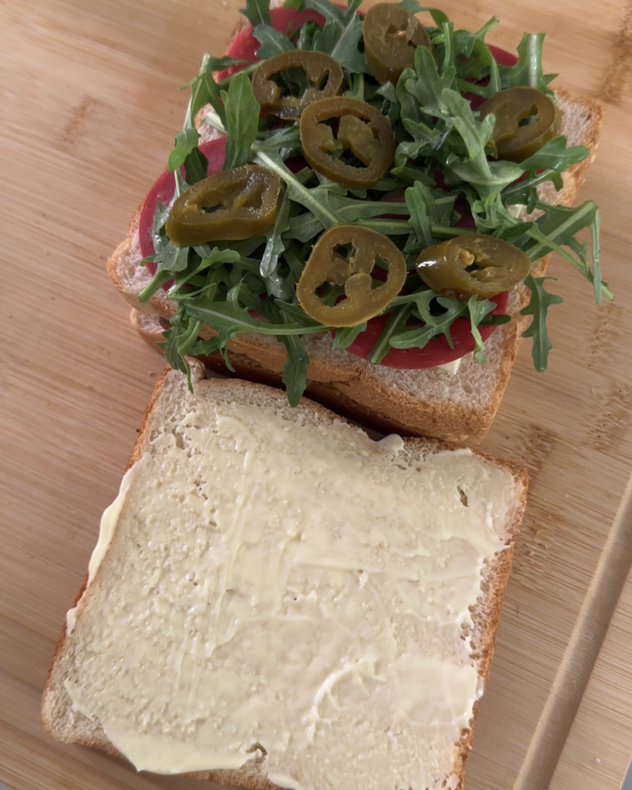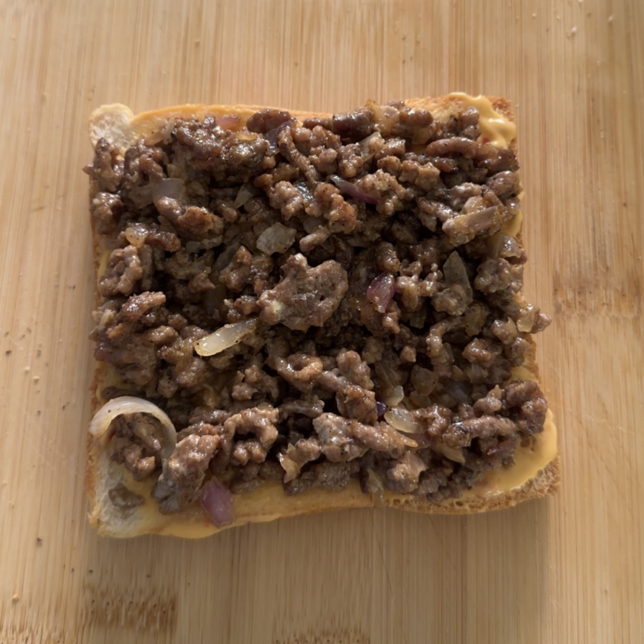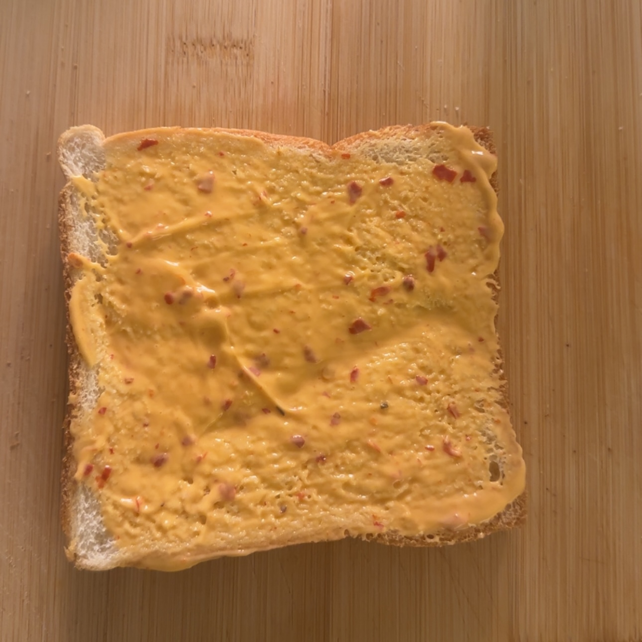 Goreng roti panggang dengan mentega, lalu tambahkan chili mayones.