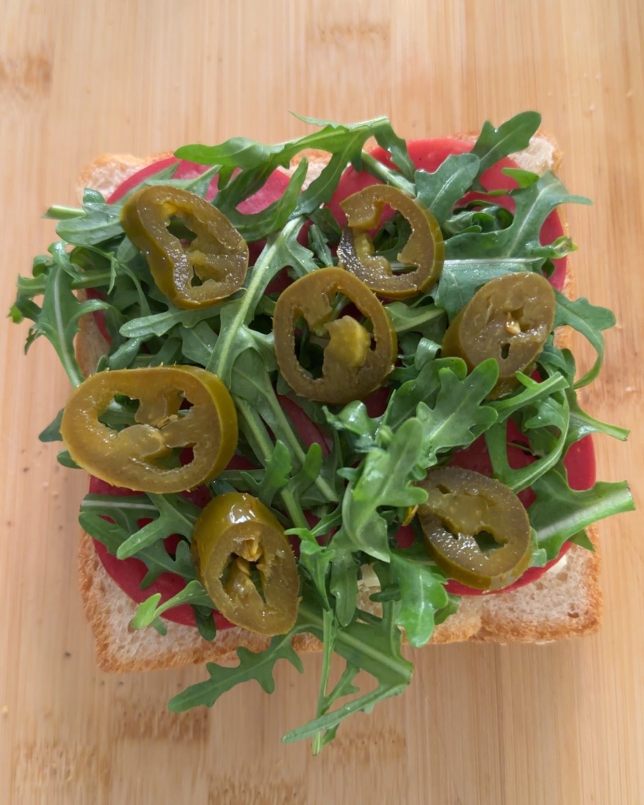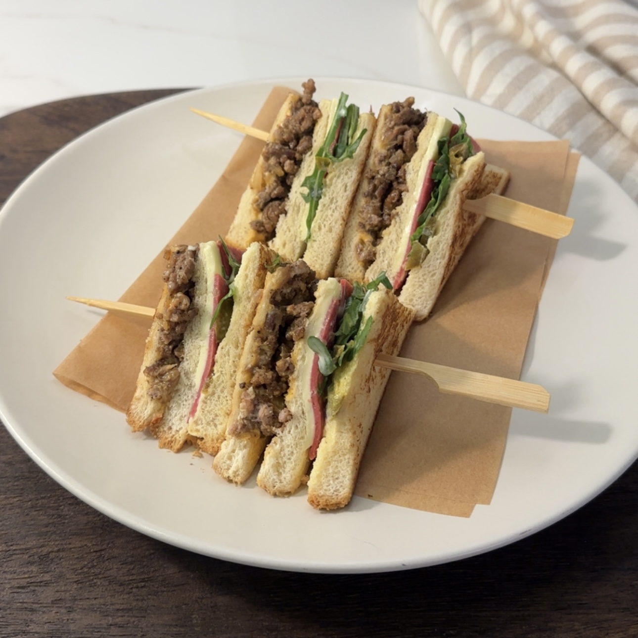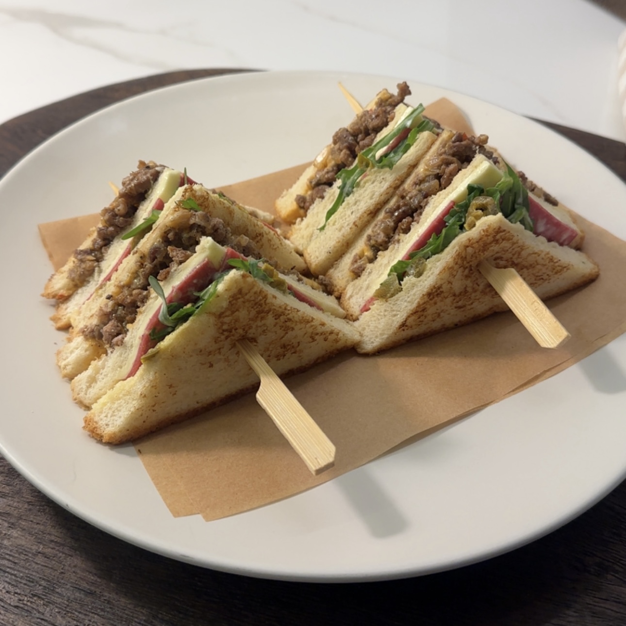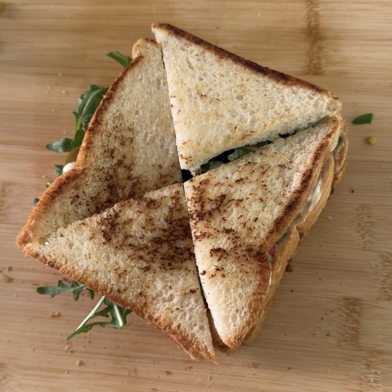 Goreng roti panggang dengan mentega, lalu tambahkan chili mayones.